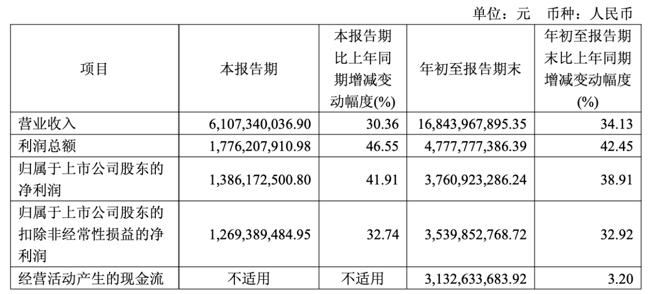 前三季度,东鹏饮料营收为168.44亿元,同比增长34.13%;净利润为37.61亿元,同比增长38.91%。