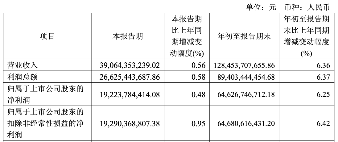 10月29日晚间,贵州茅台发布第三季度报告,2025年前三季度,贵州茅台实现营业总收入1309.04亿元,同比增长6.32%,利润总额894.03亿元,同比增长6.37%;归母净利润646.26亿元,同比增长6.25%。