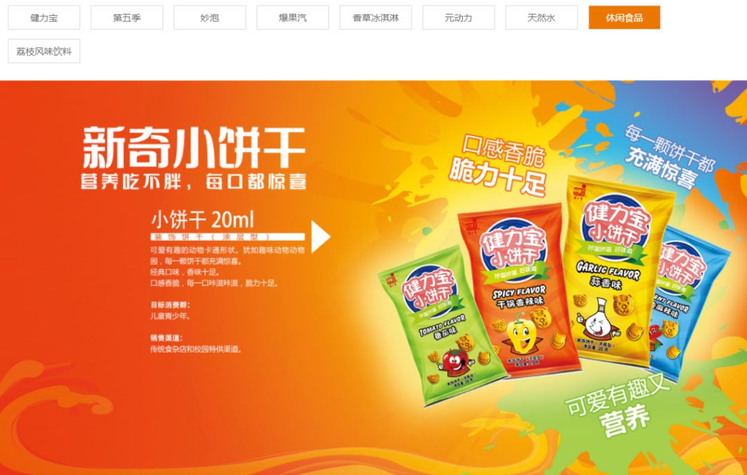 记者在查询健力宝官网时发现,从整个产品线看,健力宝似乎还有意进军食品领域,目前该公司发布的9款产品中,除了健力宝、第五季、妙泡、爆果汽、香草冰淇淋、元动力、健力宝天然水、荔枝风味饮料,还有一款休闲食品“健力宝小饼干”。
