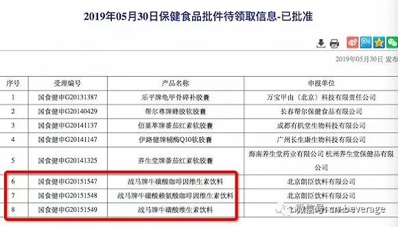 近日,国家药品监督管理局公布的保健食品批件待领取信息显示,北京朗臣饮料有限公司拥有的战马牌牛磺酸咖啡因维生素饮料、战马牌牛磺酸赖氨酸咖啡因维生素饮料、战马牌牛磺酸维生素饮料3款饮料获得了保健食品标志,就是俗称的“蓝帽”标识。