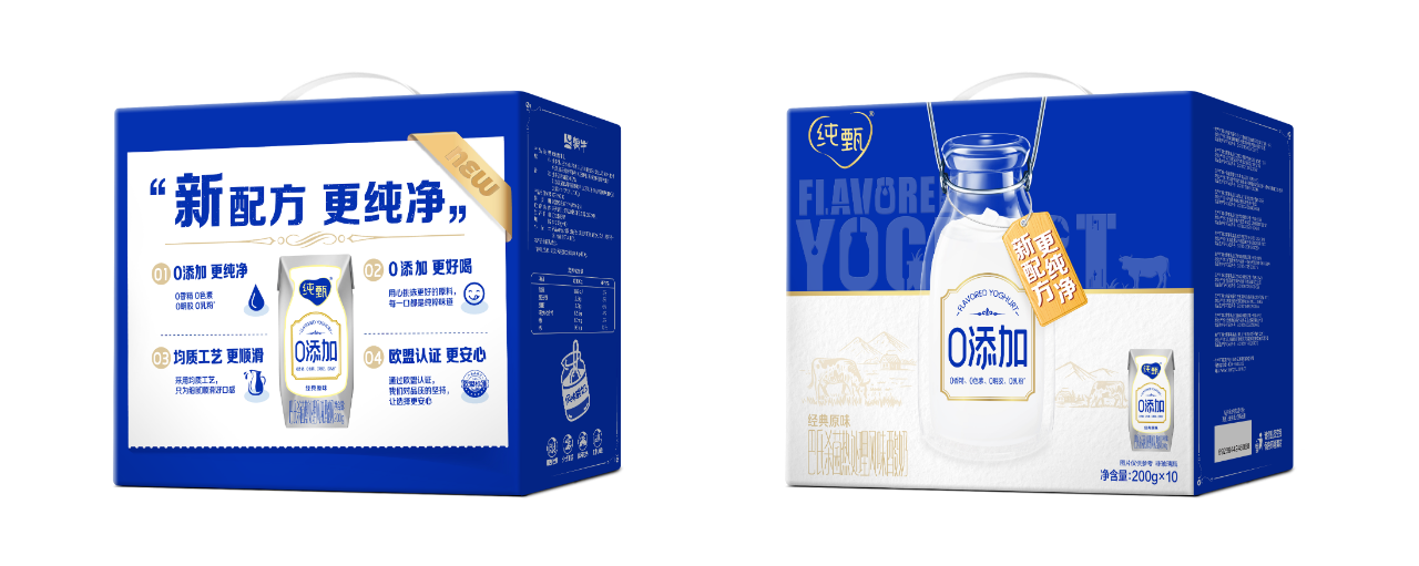 除了配方与工艺上的创新升级,纯甄0添加酸奶还获得了欧盟标准认证。不仅如此,在纯甄0添加酸奶包装上,其配料表十分清晰,一眼就懂。