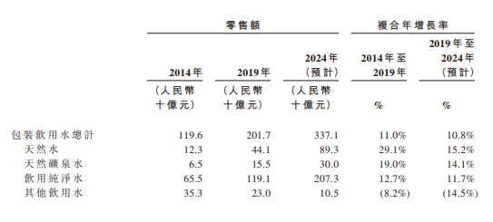 弗若斯特沙利文报告数据显示,按零售额计算,天然矿泉水2019年的零售额为155亿元,2014年~2019年间的复合年增长率为19.0%,增速在包装饮用水的四个分类中排名第二。